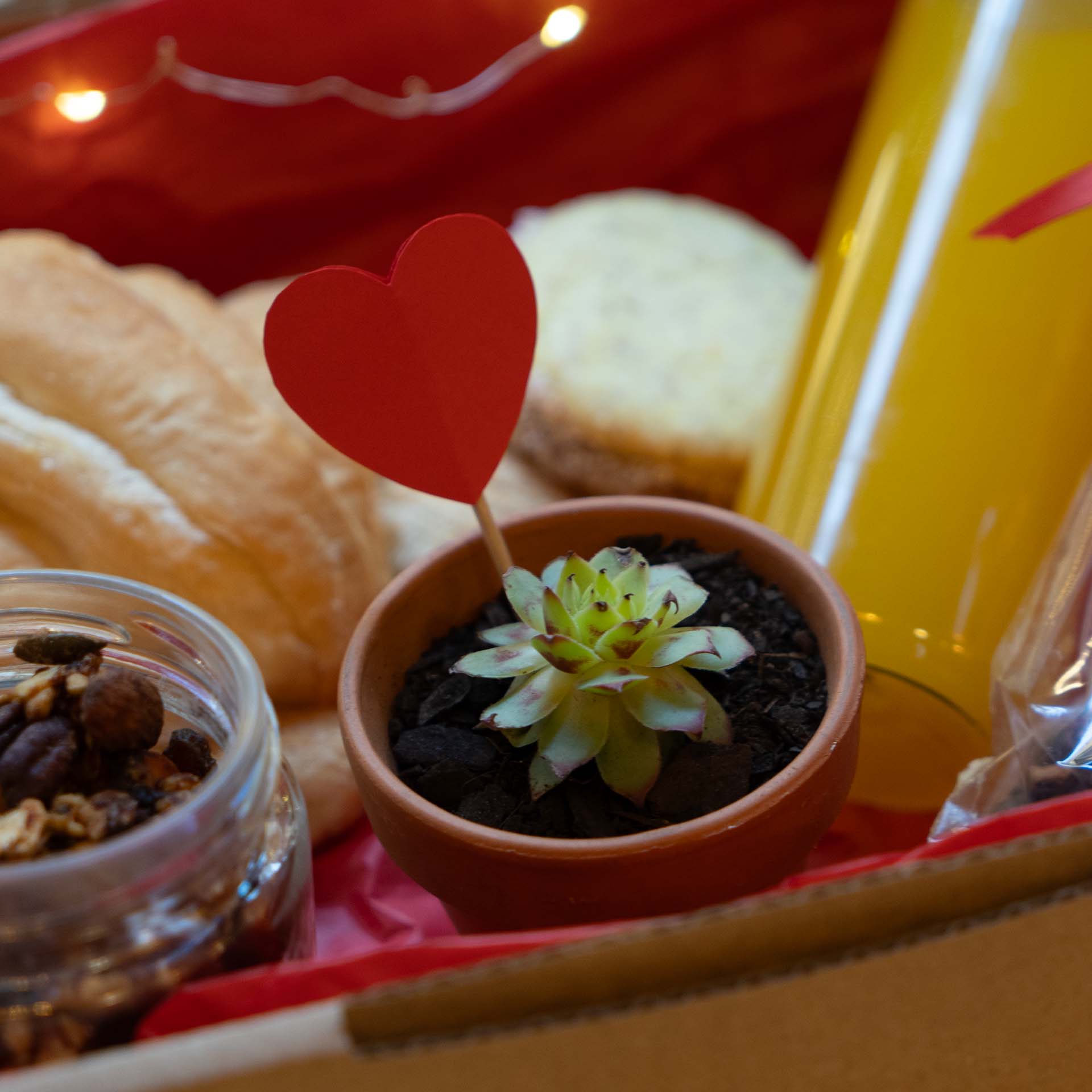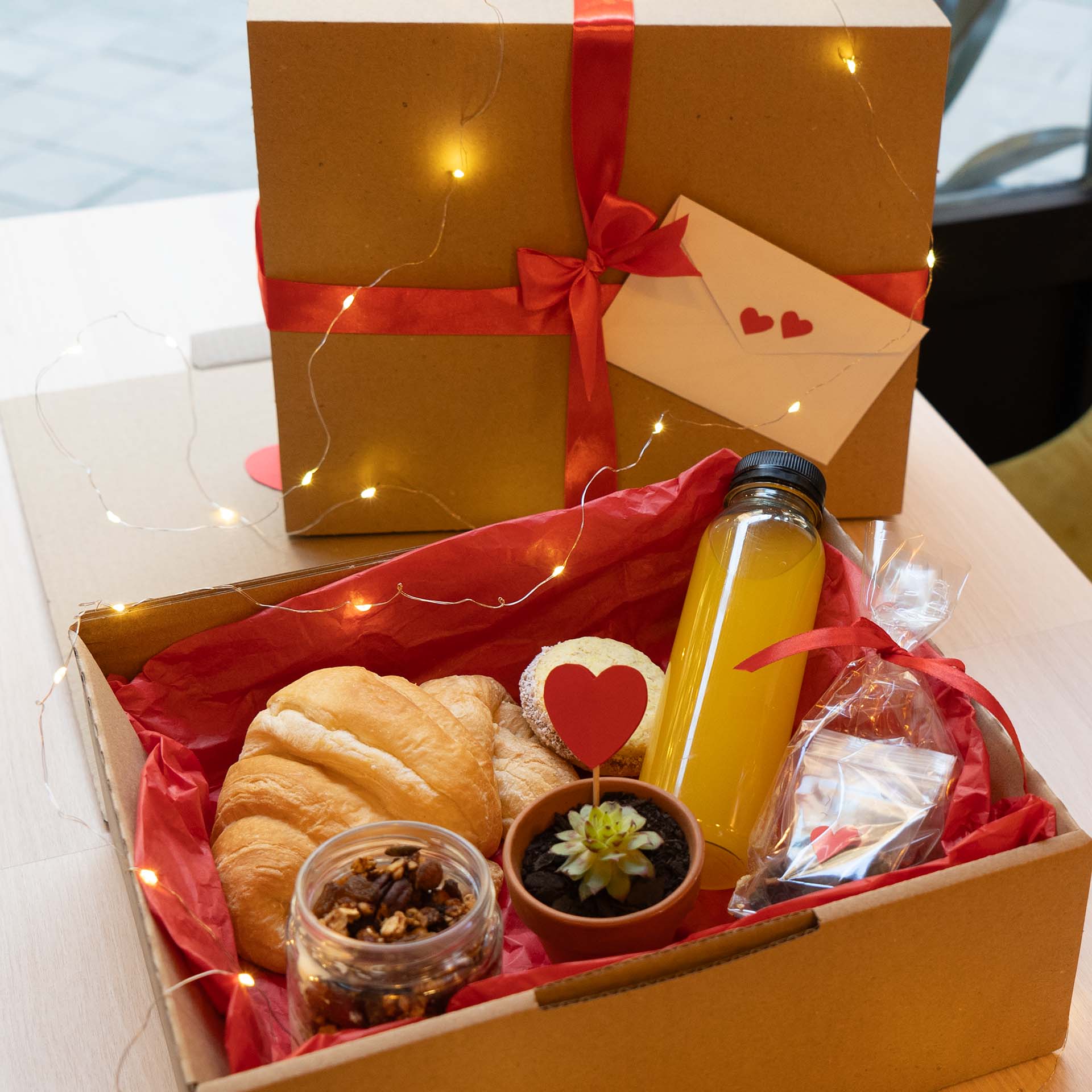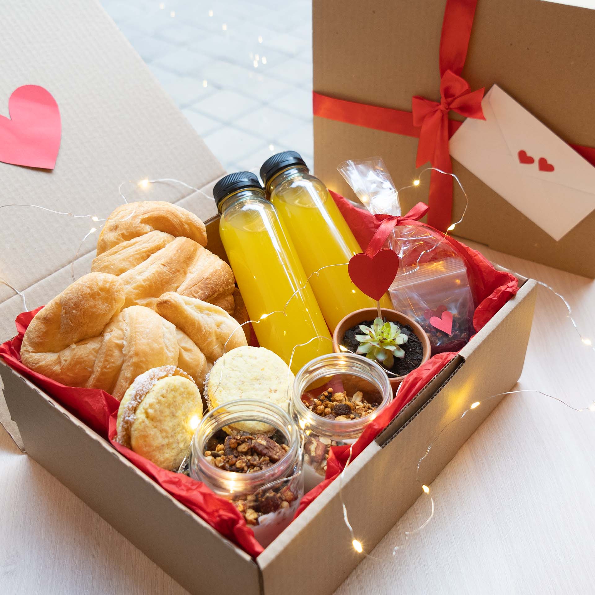 PREMIUM 2 sanguchitos de miga, croissant, alfajor, 3 trufas, porción de pastafrola, chocotorta oreo, bizcocho, zumo de naranja, Iced café con leche o matcha, plantita Che Vegan, tarjeta con dedicatoria.