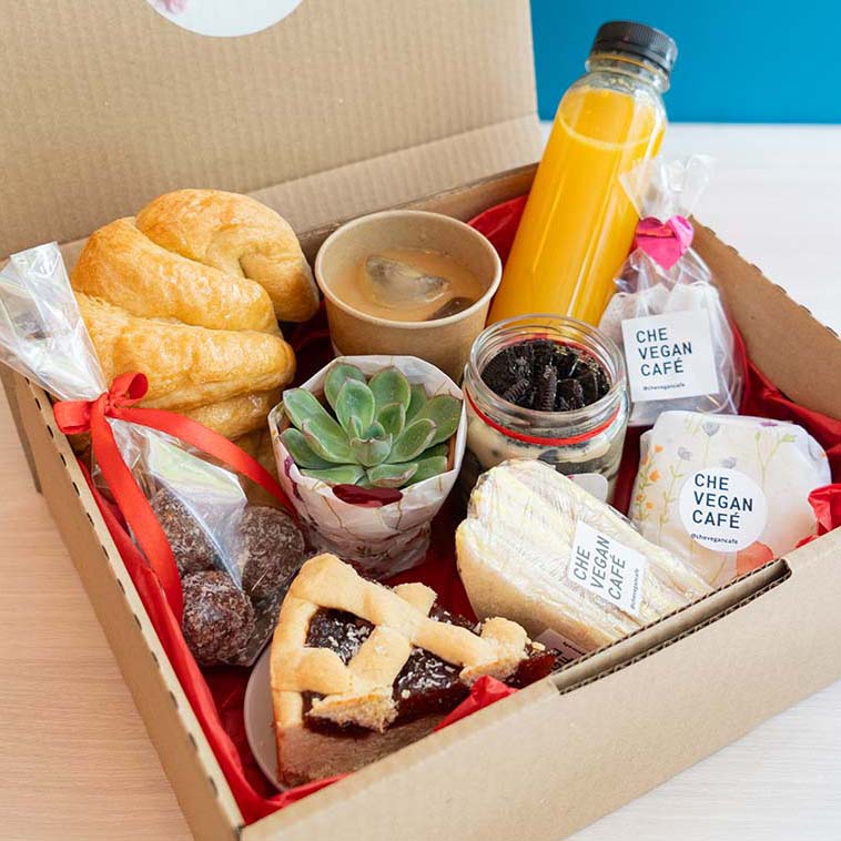 En Che Vegan preparamos con mucho cariño nuestros desayunos sorpresa 100% veganos, y los personalizamos para cada ocasión: cumpleaños, aniversarios… ¡o lo que tú quieras!